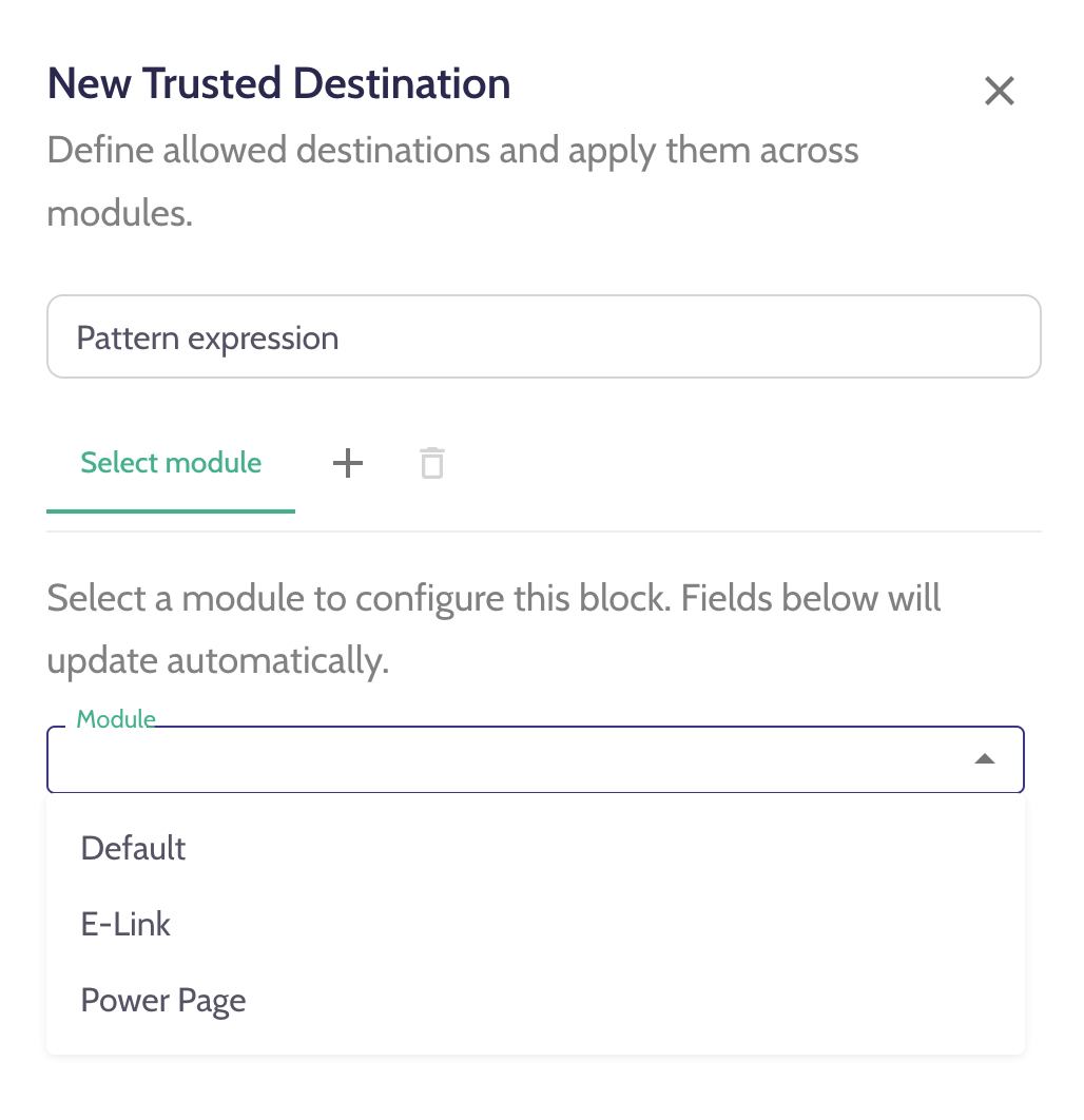 The PowerPages module allows you to create Trusted Destinations for PowerPages. After selecting PowerPage as the module, you may then apply the new Trusted Destination to a specific PowerPage.