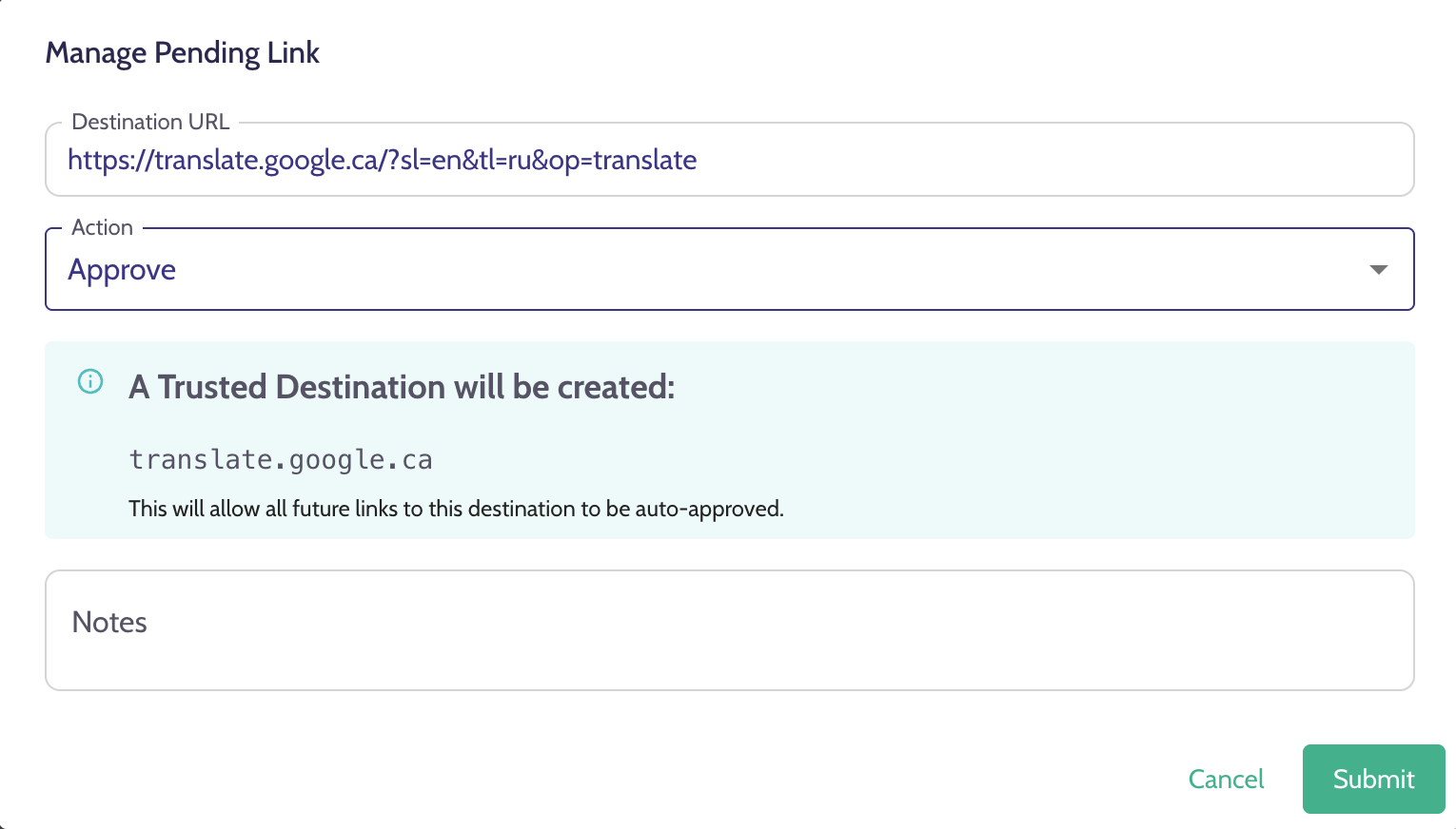 Trusted Destinations provide Enterprise admins with the ability to pre-approve safe destinations, ensuring that all links created adhere to company safety and compliance standards.